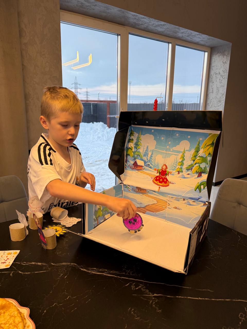 Основой для постановки была выбрана добрая сказка Татьяны Кирюшатовой «Жил-был блин». Идея проекта уникальна тем, что все декорации и герои были созданы руками детей. Коробка превратилась в сценическое пространство, а картонные персонажи обрели душу.