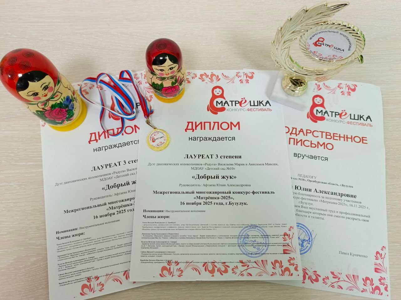 Во Дворце культуры "Юбилейный" прошел Межрегиональный многожанровый конкурс-фестиваль "Матрёшка - 2025". Воспитанники нашего детского сада Анисимов Максим и Васильева Мария (муз. руководитель Автаева Ю.А.) приняли участие и стали лауреатом 3 степени в номинации "Инструментальное исполнение" (дуэт диатонических колокольчиков "Радуга"). Поздравляем с победой и желаем дальнейших творческих успехов!!!